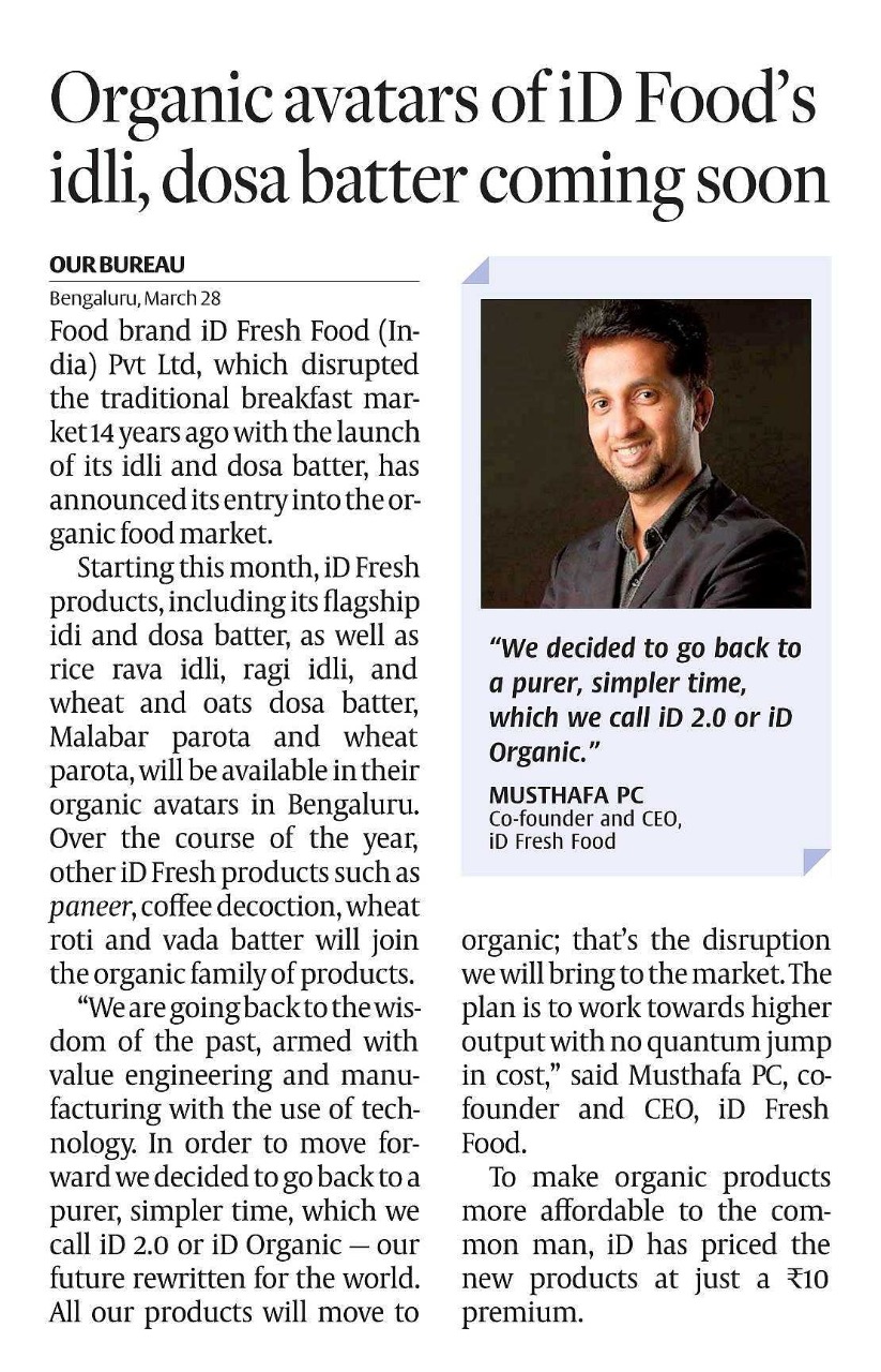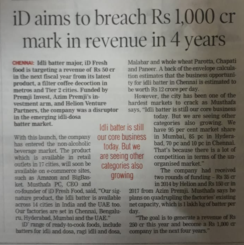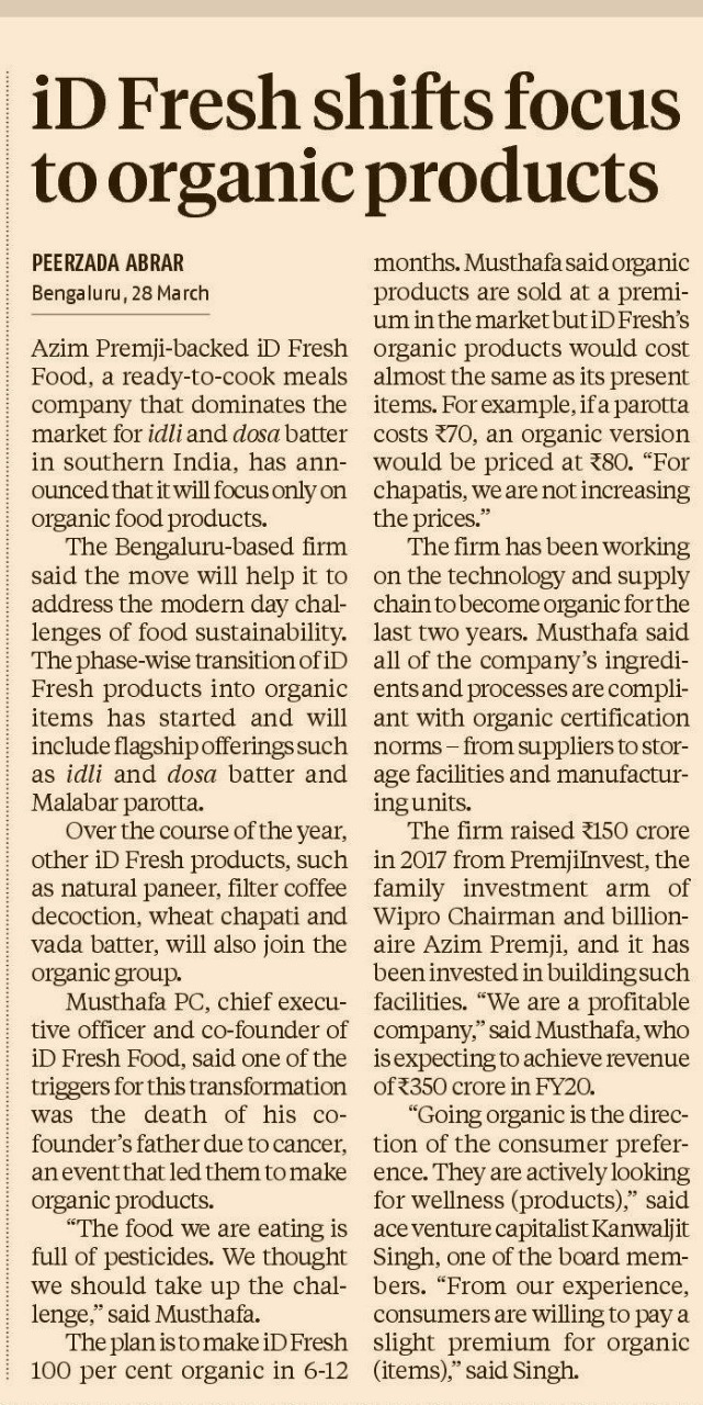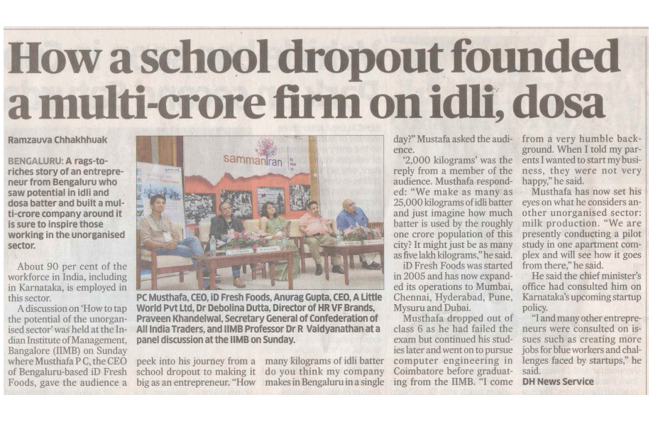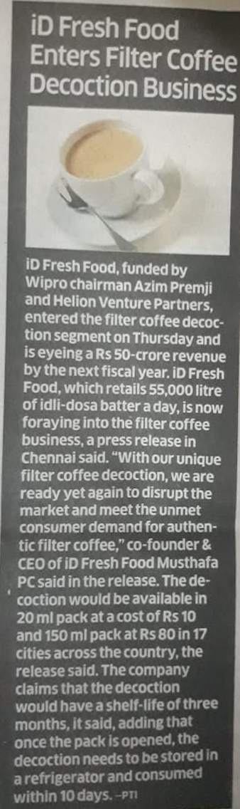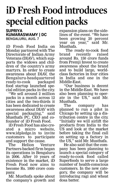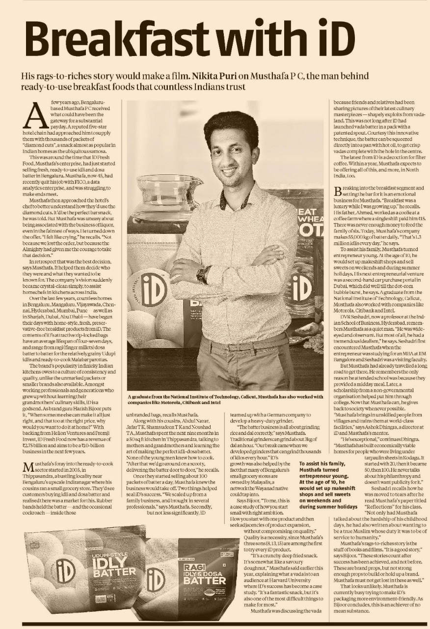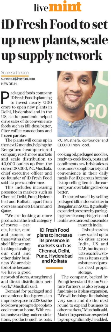 India SME forum in association with Micro, Small & Medium Enterprises (MSME) Government of India, awarded iD Fresh Food as one of the top 100 SME companies in the overall evaluation of financial and non-financial parameters amongst 49023 nominations.