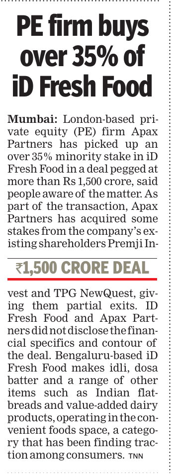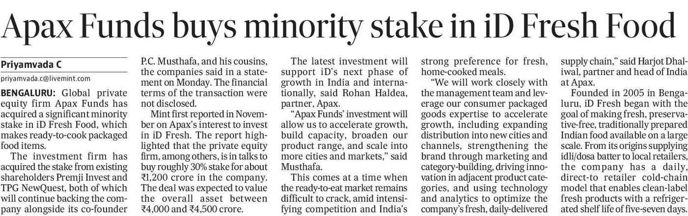 Hindustan Times - Apax Funds buys minority stake in iD Fresh Food