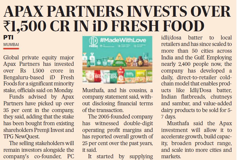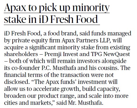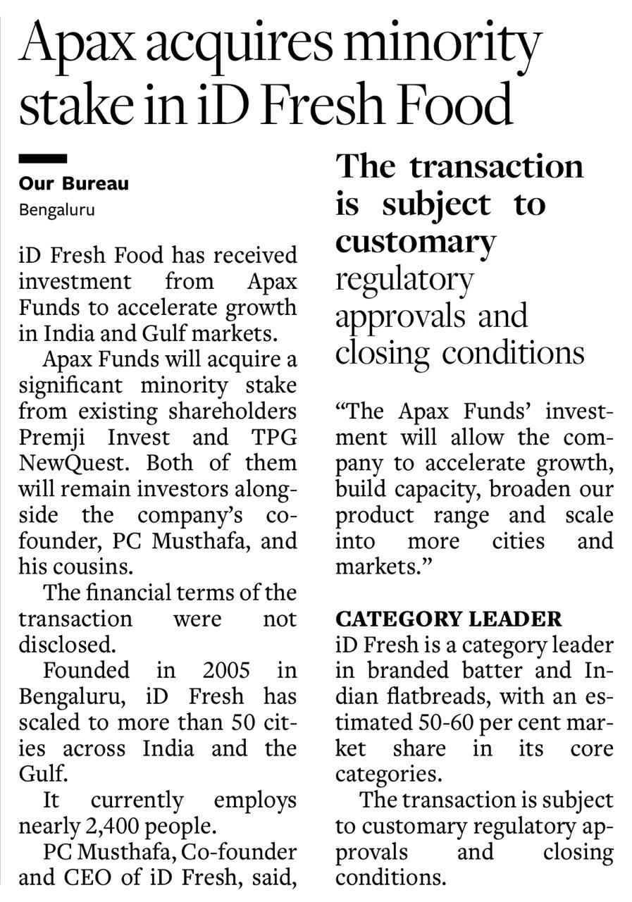 The Hindu Business Line - Apax acquires minority stake in iD Fresh Food