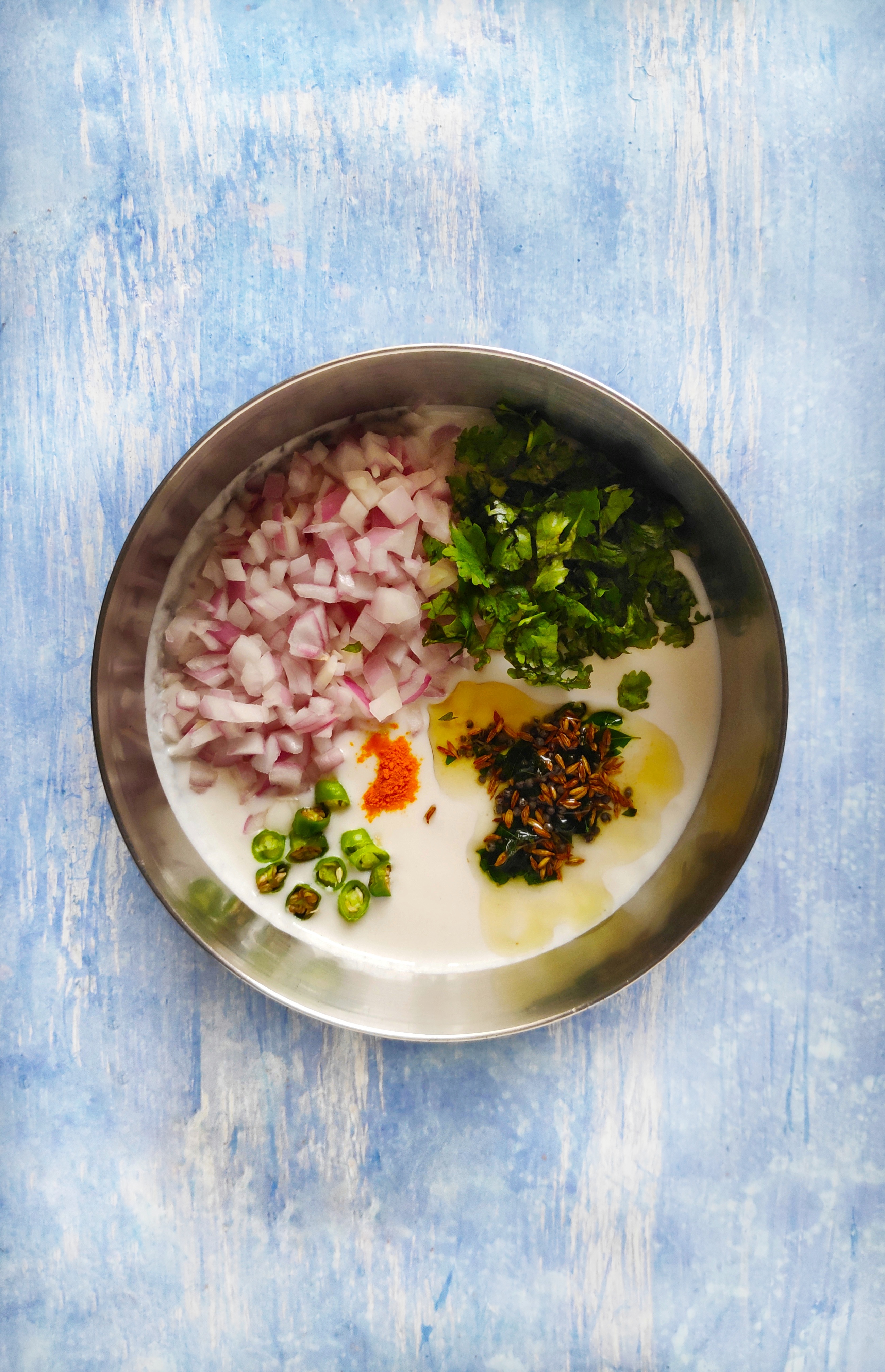 - In another bowl, add the dosa batter along with the chopped onion, chillies, (any other vegetables you would want), turmeric powder, and the above-sauteed mixture and mix it properly.
