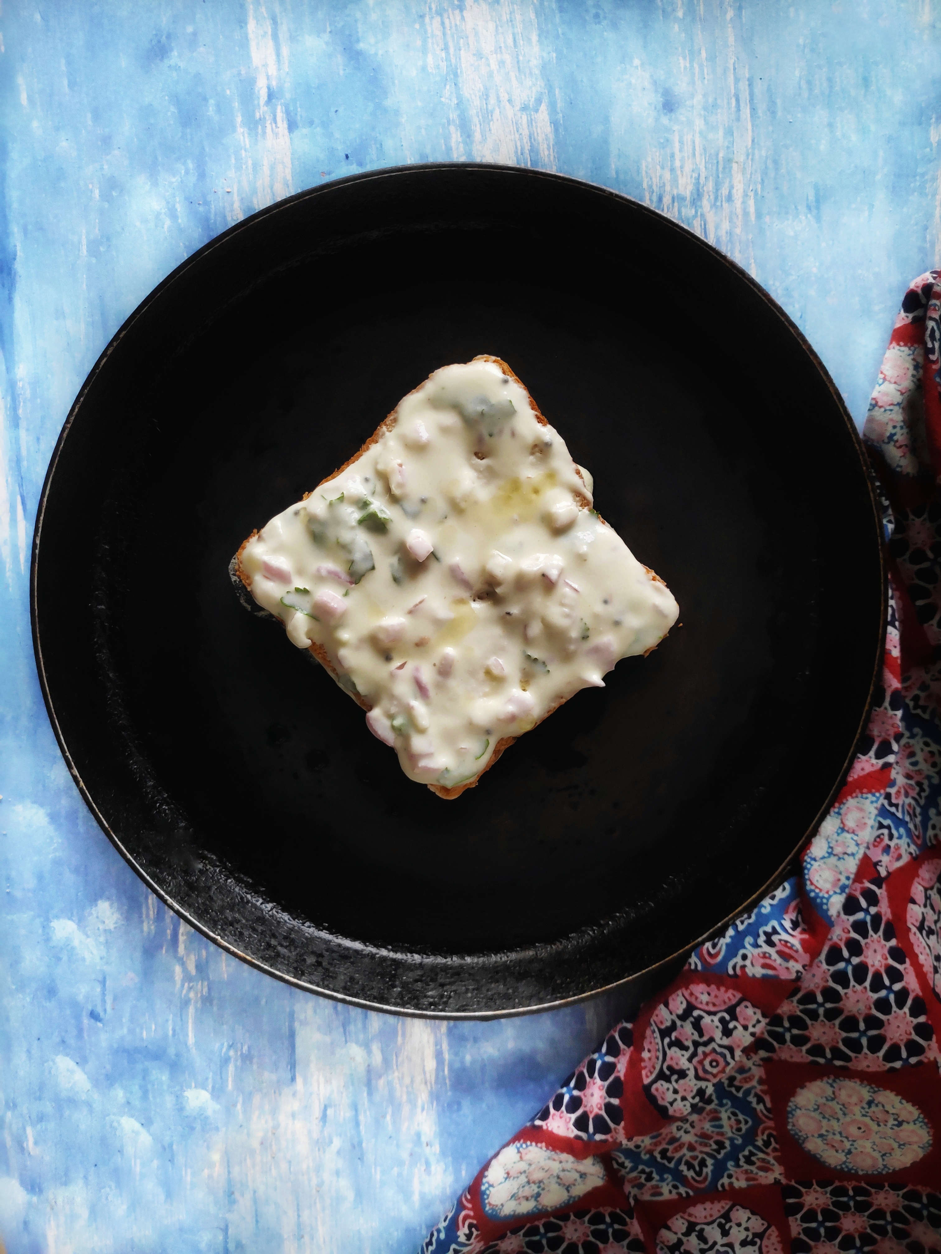 - Next, heat a non-stick Tawa/griddle and add a few drops of oil. You can also use butter for toasting the bread.