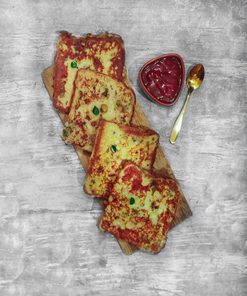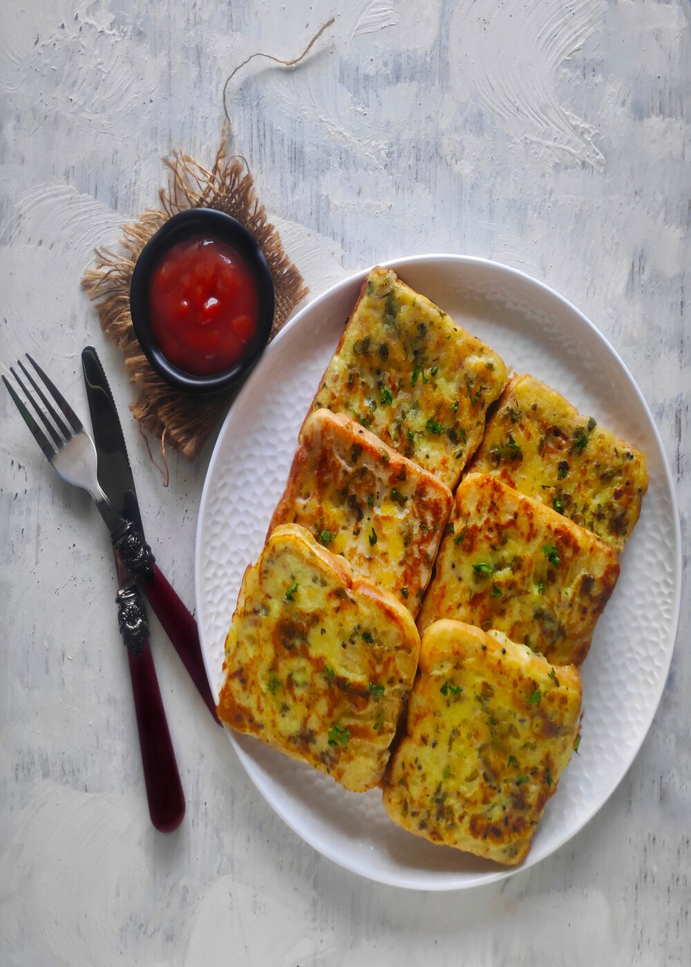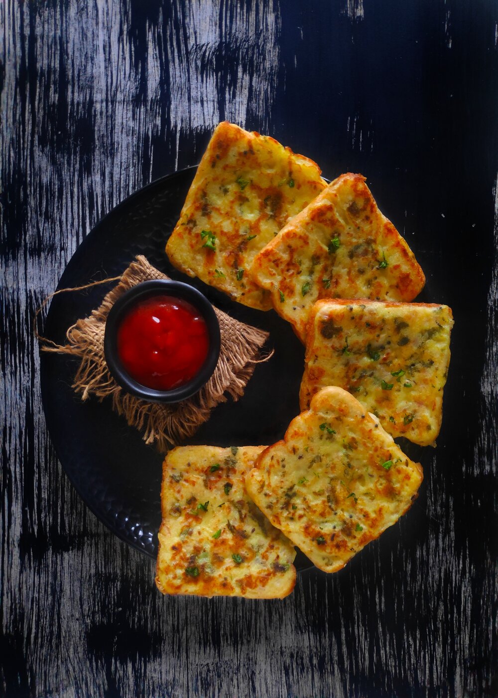 - Dip one side of the bread slice in the batter prepared and put it on the Tawa. Toast it on a medium flame until it turns golden brown.