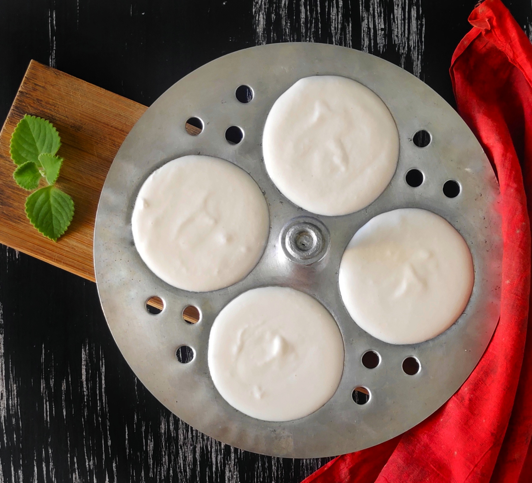 - Remove the idli plates and let them cool for 3 minutes before removing the idlis from the mold.