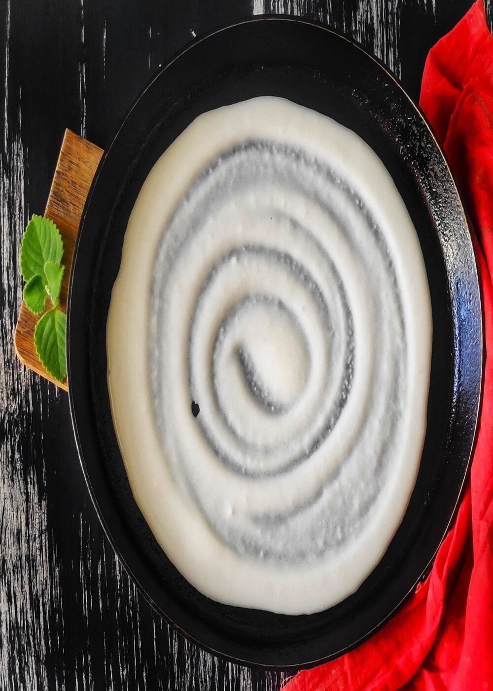 - On medium high flame, spread a ladleful of batter in the shape of the pan.