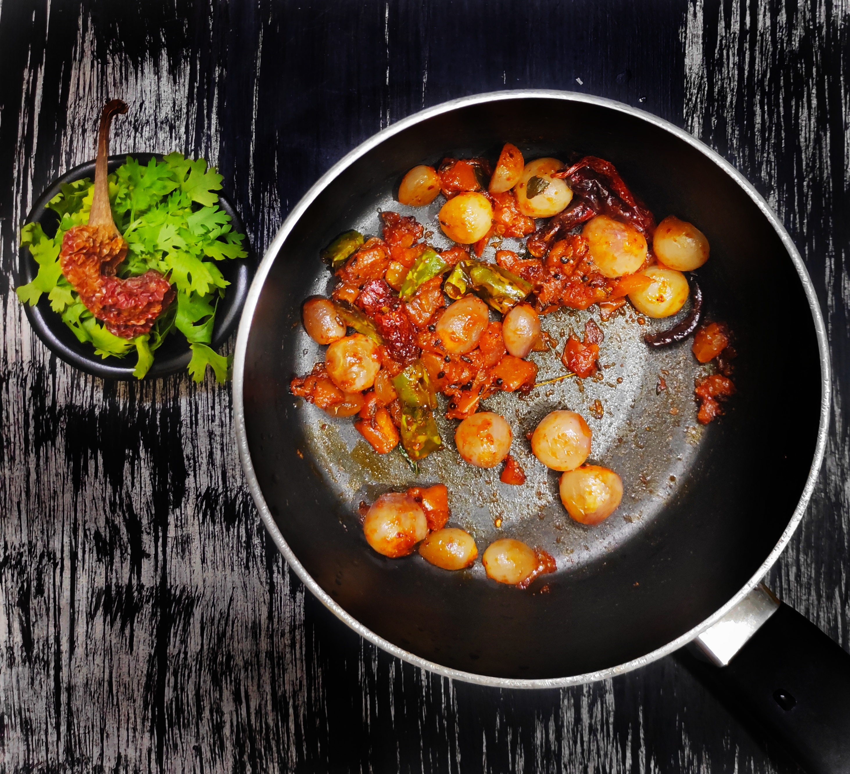 • Once you hear the sound of spluttering, add red chillies, green chillies, and curry leaves.