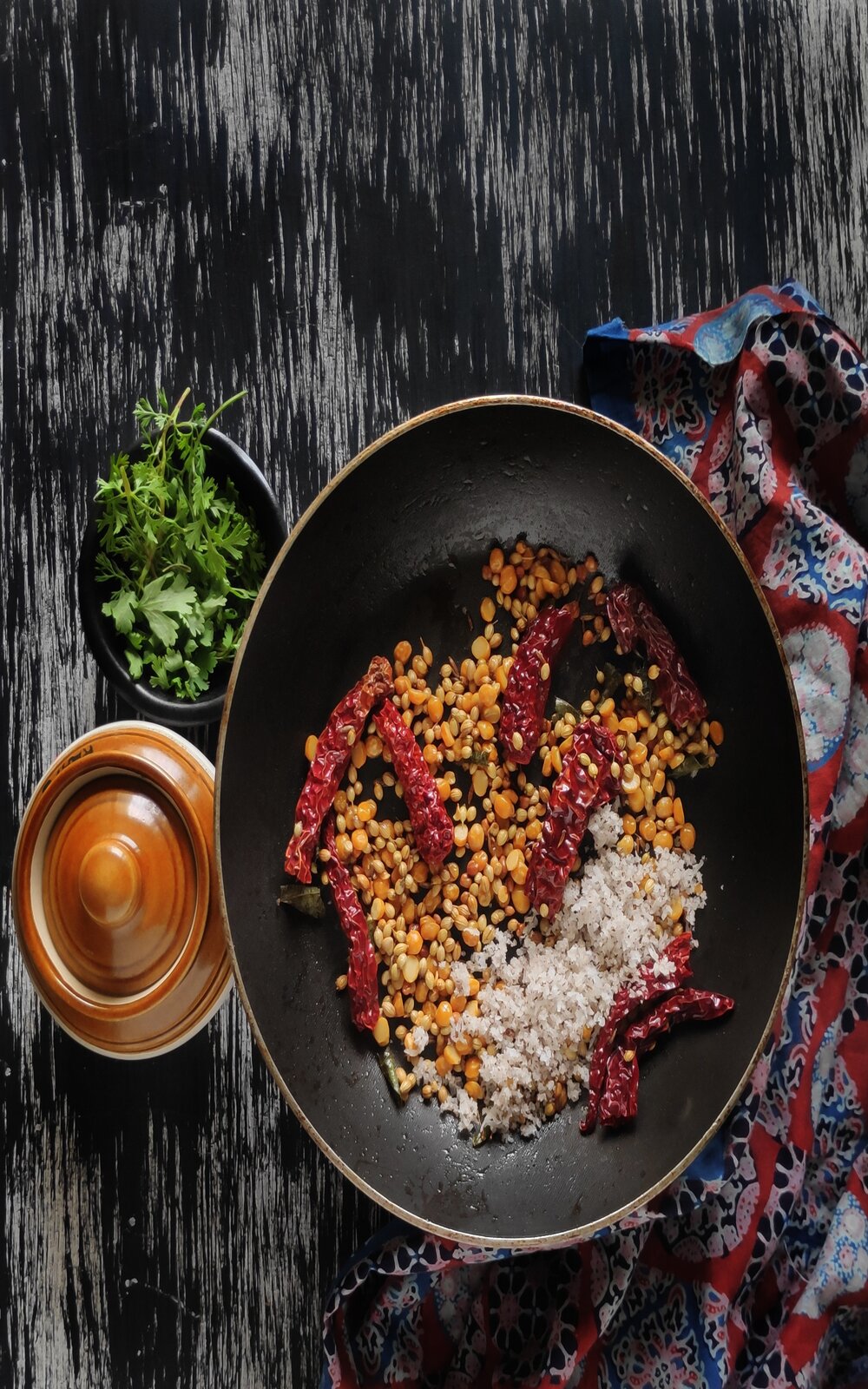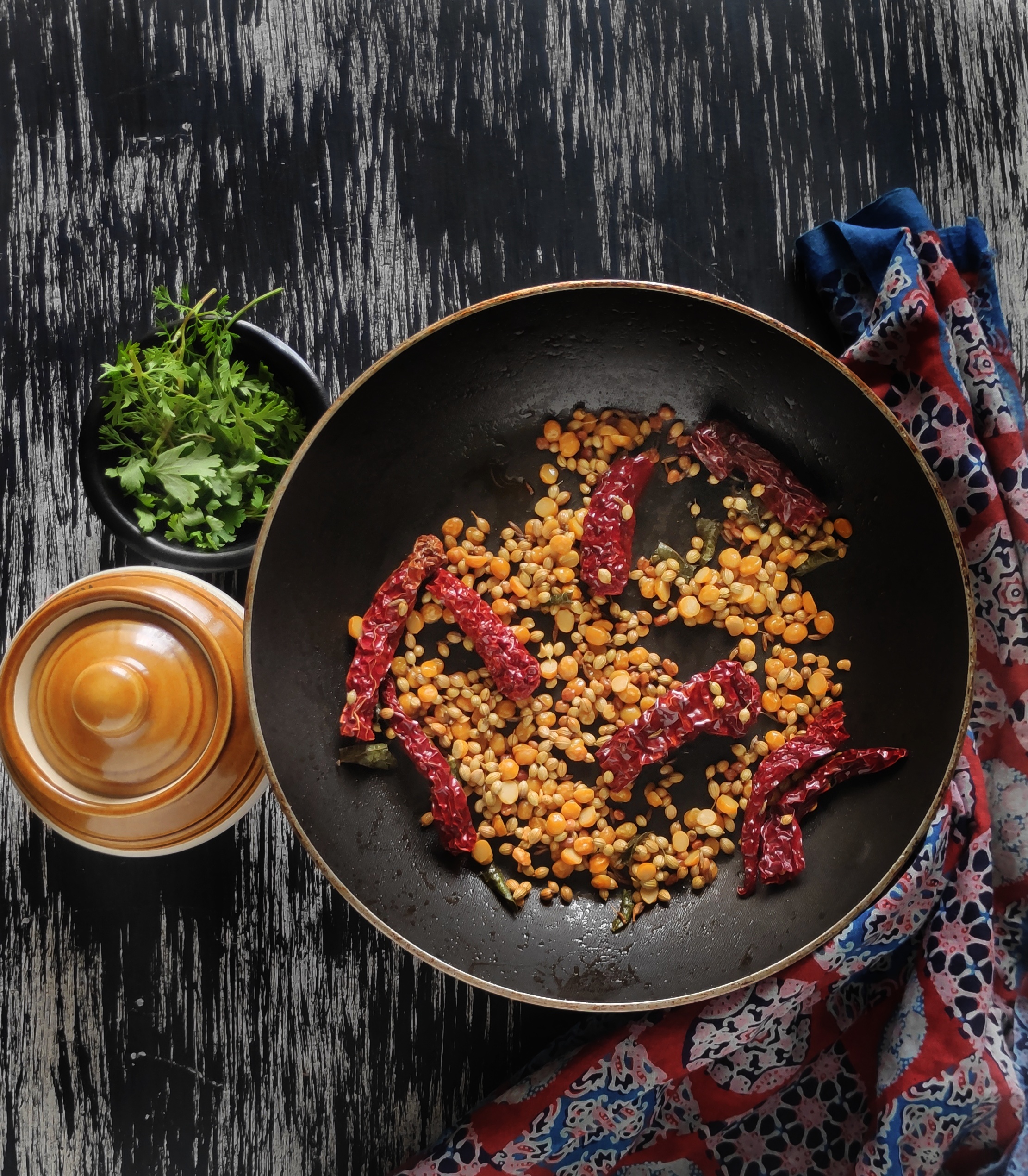 - Once the seeds start sizzling, add the Bengal gram lentils, red chilies, cumin seeds, and coriander seeds. Roast all the ingredients together in low to medium flame. Take care not to burn the ingredients.