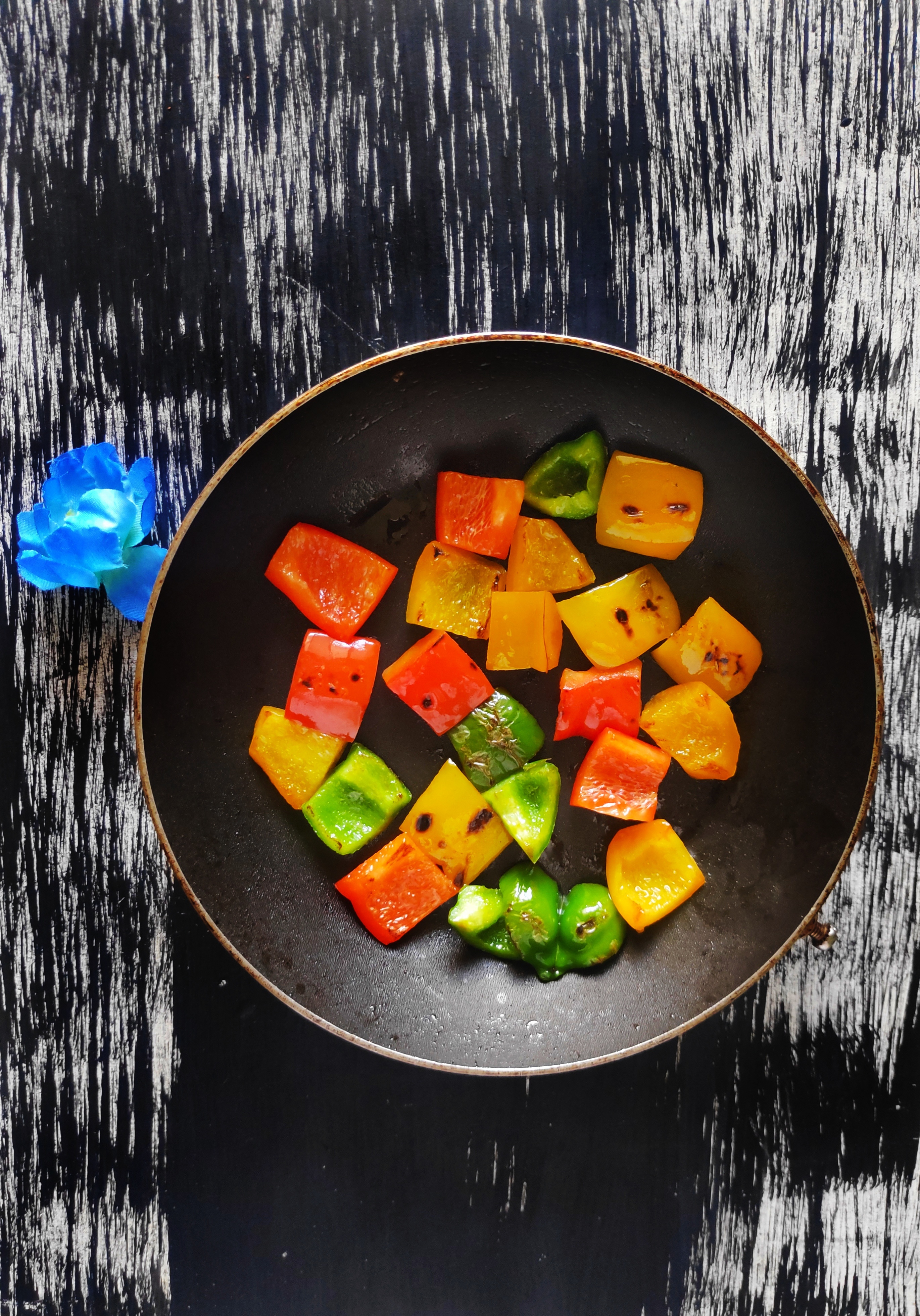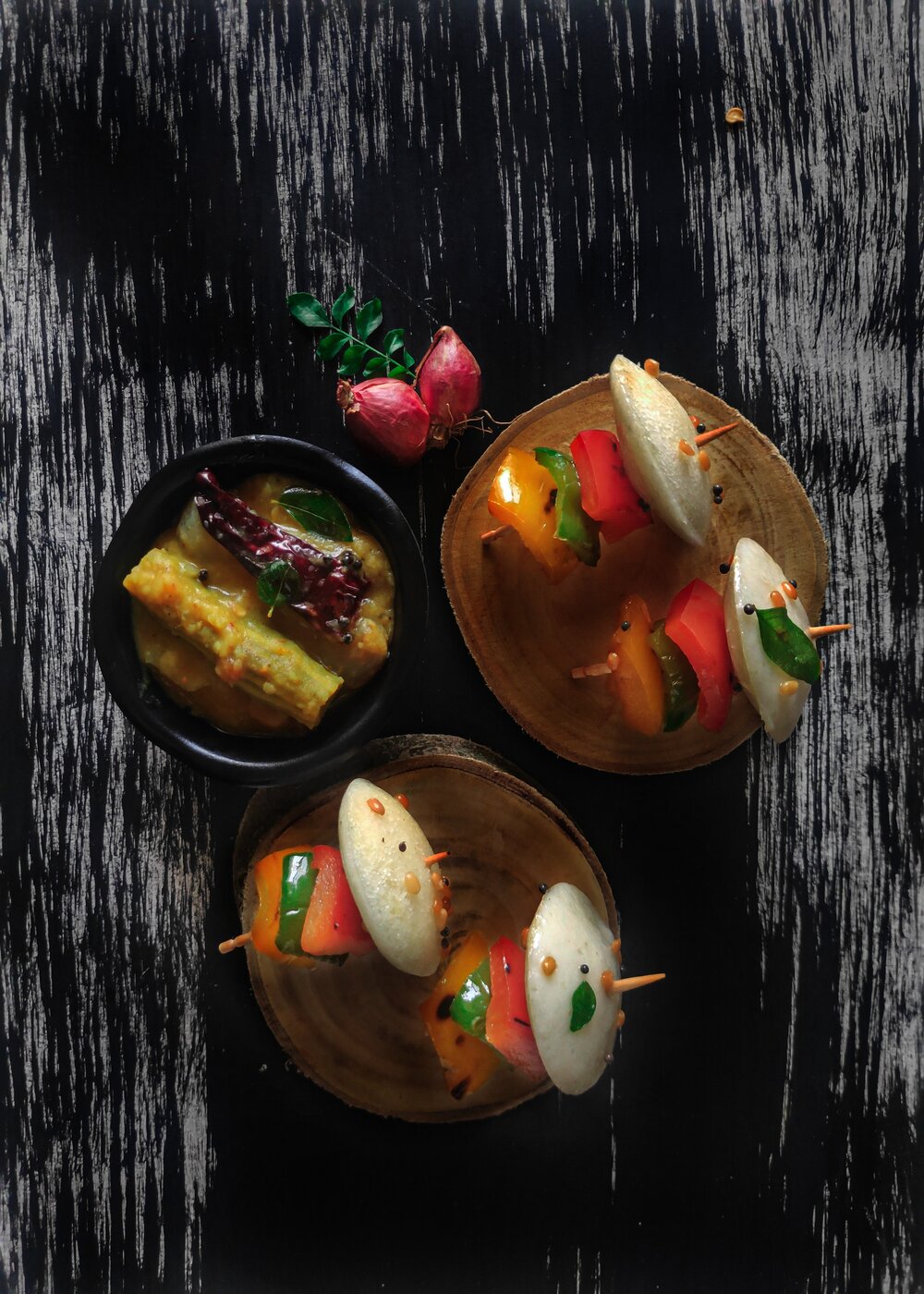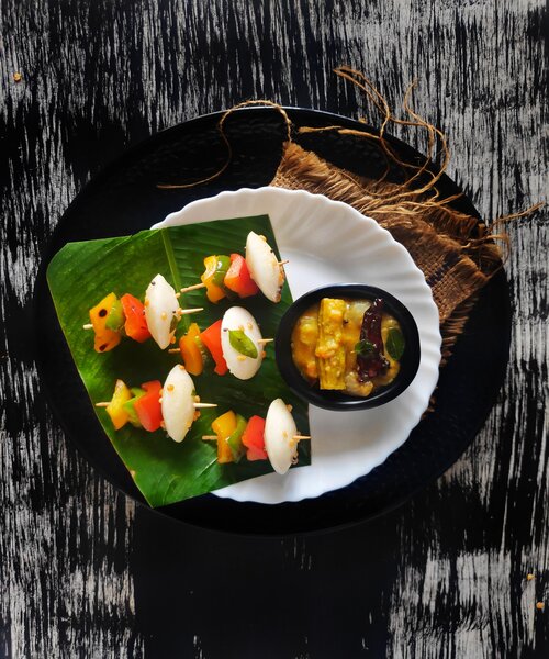 - Take a wooden skewer, pierce yellow, red, and green bell peppers, and one idli.