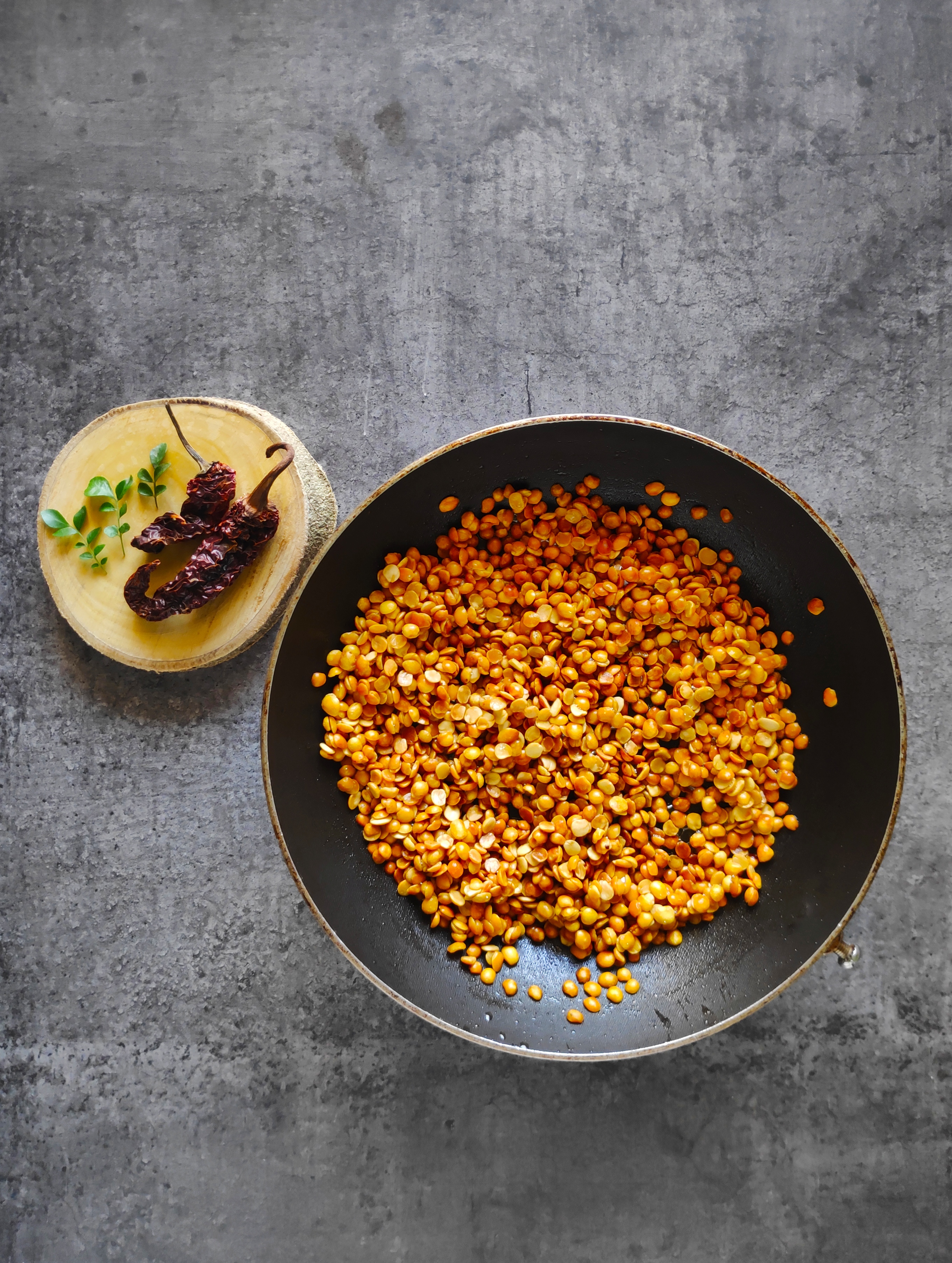 - Next, take a pan and heat oil in it. Saute the toor dal on low to medium flame till you get a pleasant aroma or it is slightly brown.