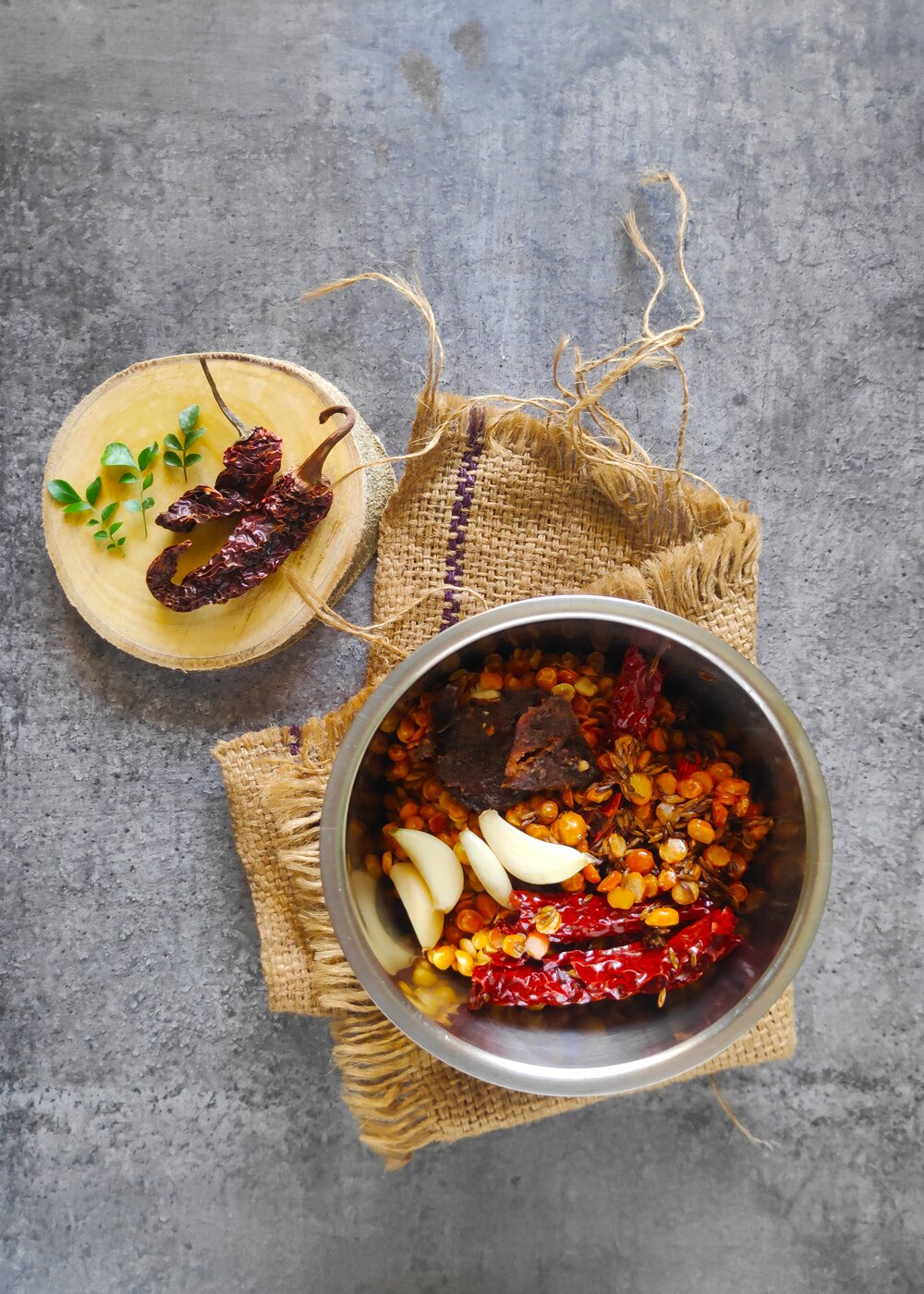 - Now, add red chillies and roast them for half a minute or until it’s crisp. Keep the mixture aside from the pan and let it cool it down.