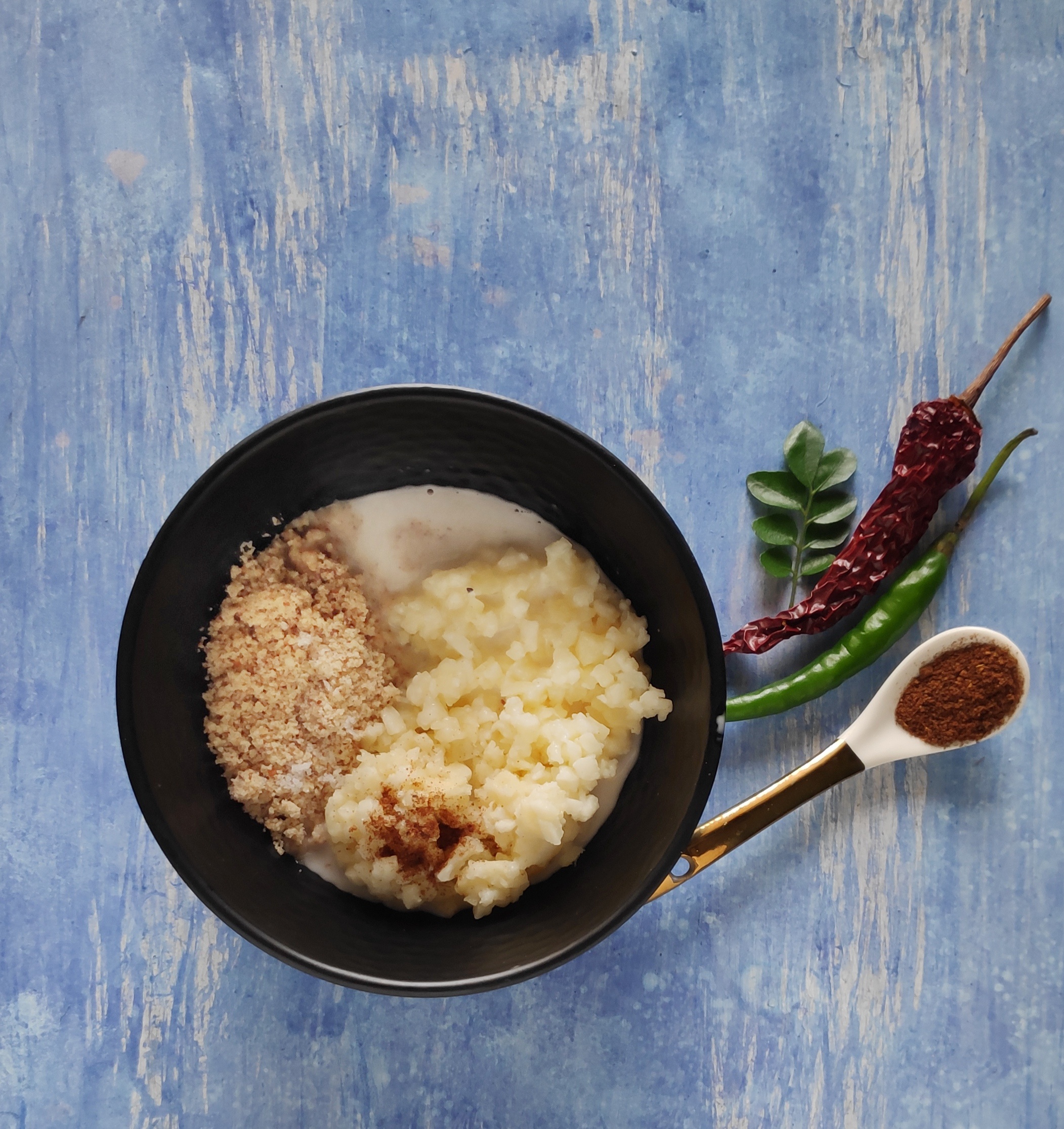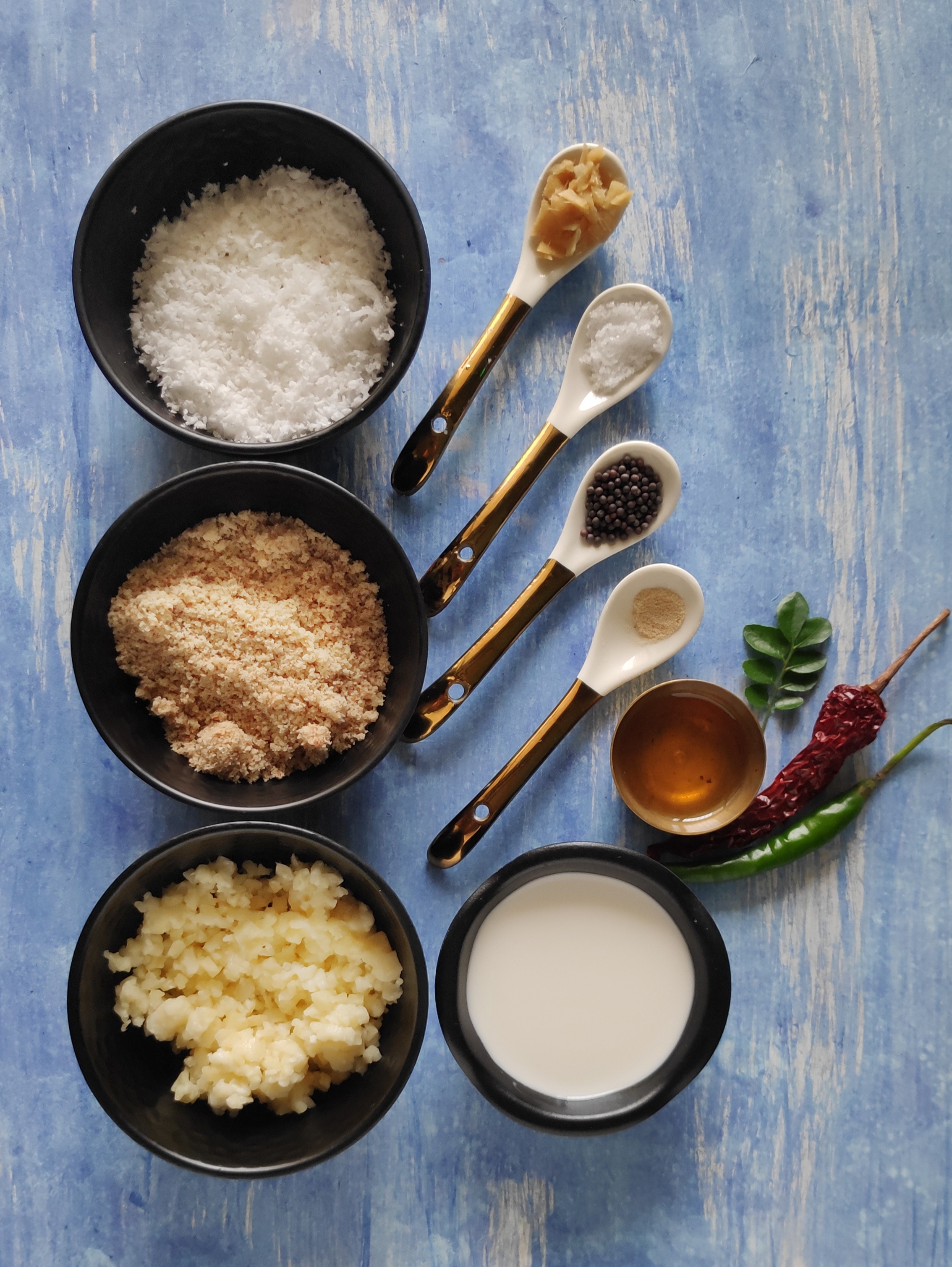 - Blend together the coconut, chilly, salt and ginger with some water to make a coarse chutney.