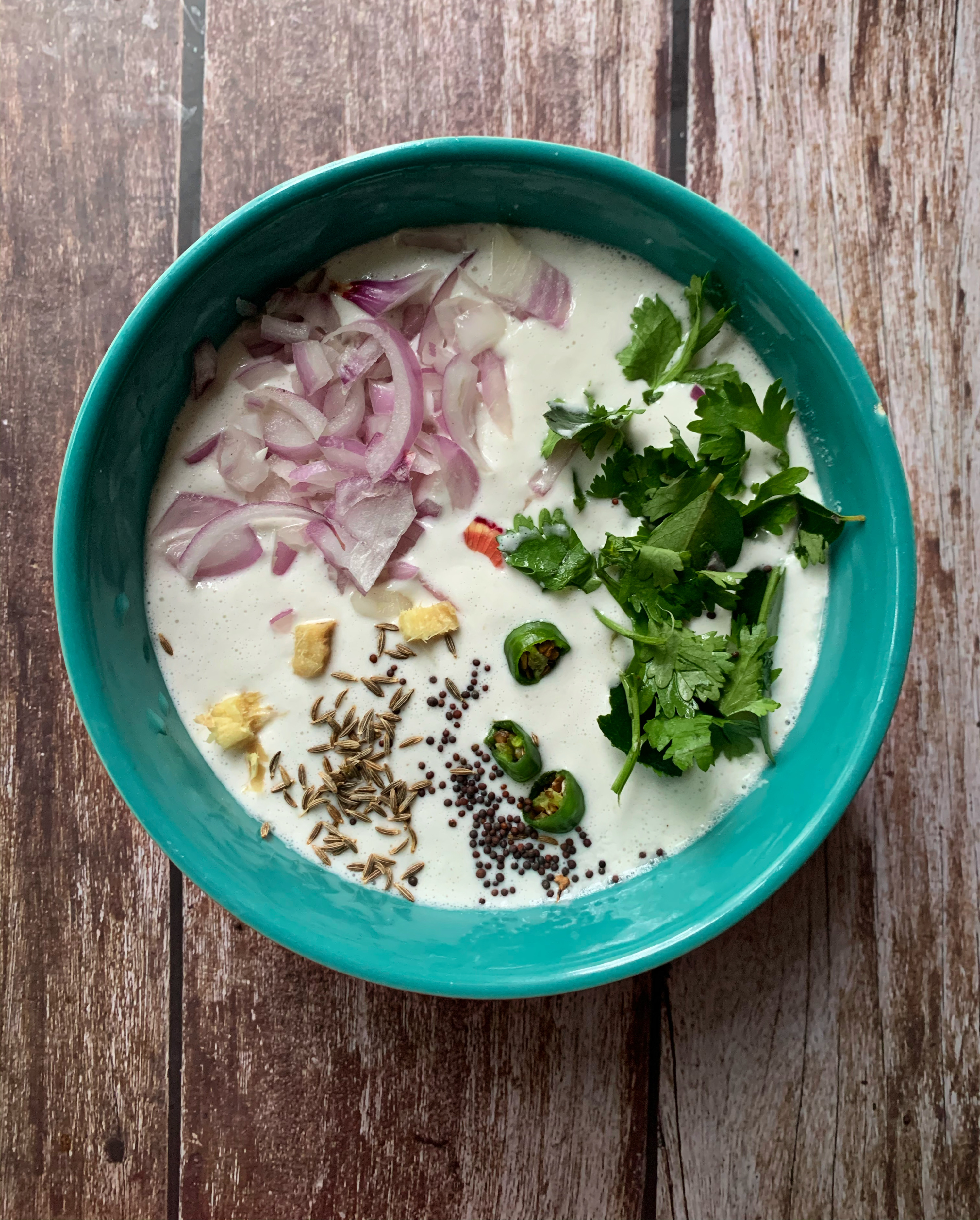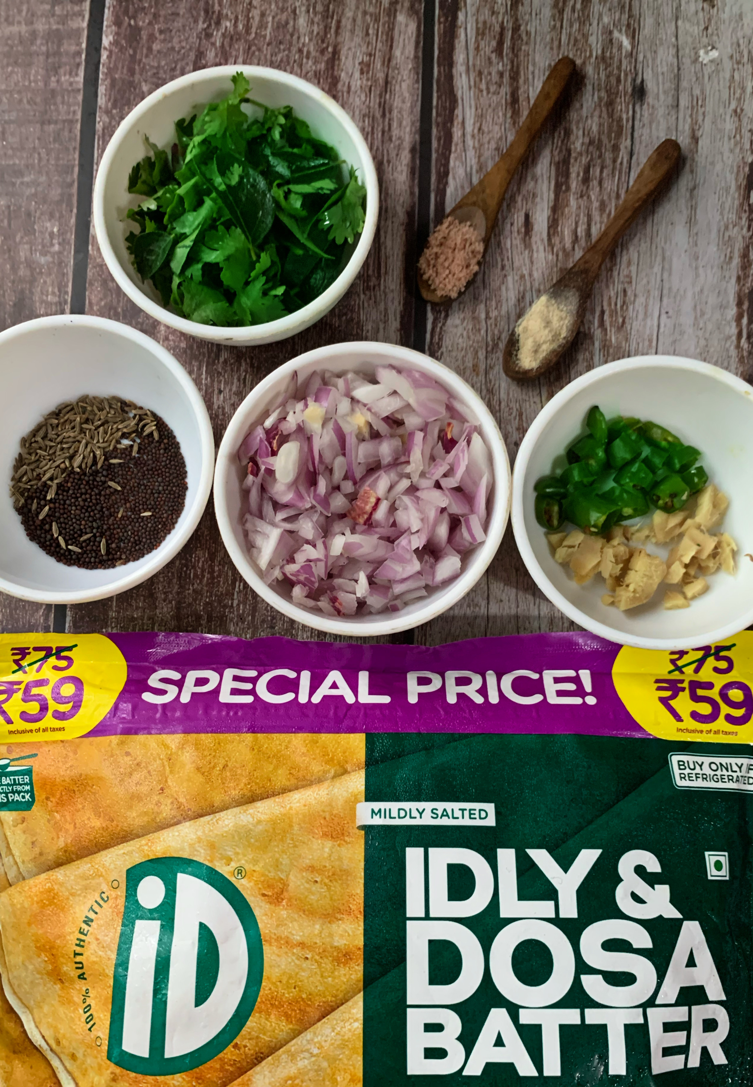 - In a large bowl, mix the dosa idli batter, curry leaves, ginger, green chillies, chopped coriander, and salt. Make sure that they are all evenly mixed.