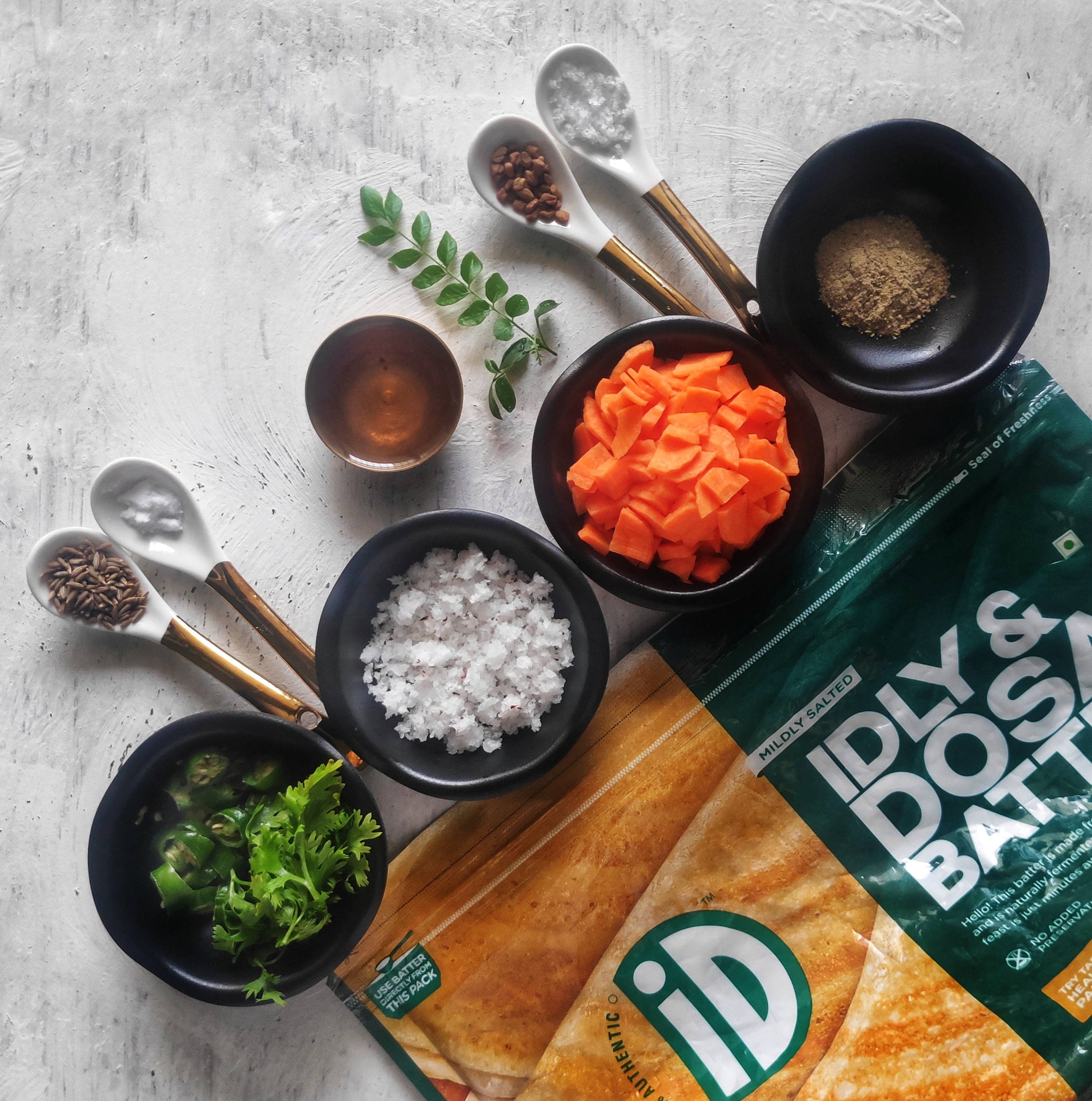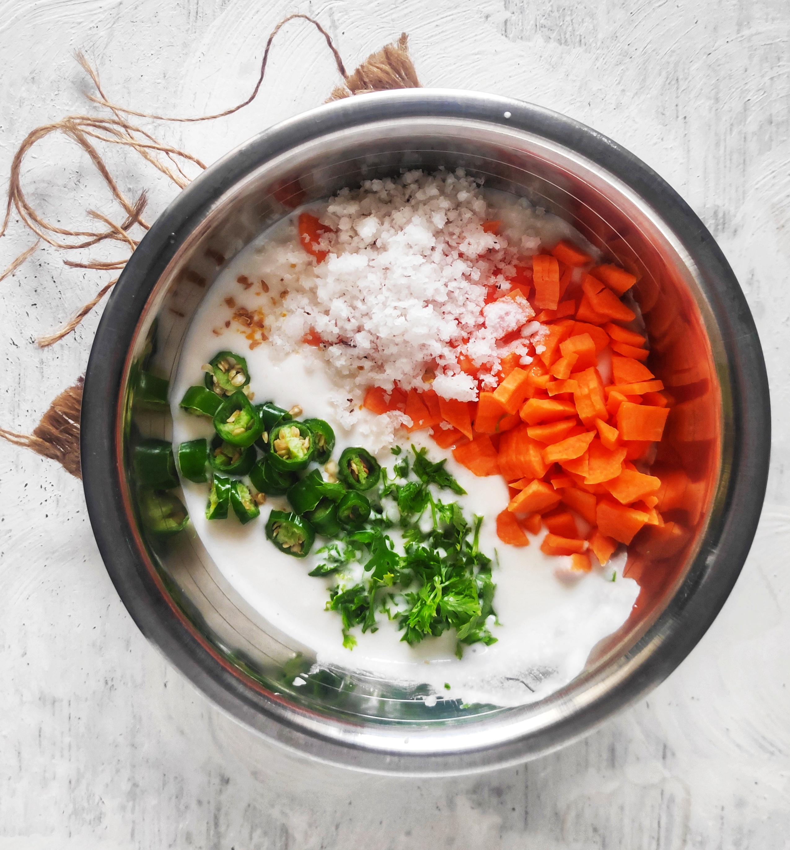 - Now, you will need finely chopped carrots, green chillies, and coriander leaves for mixing with the idli batter. You can also consider using more vegetables as per your choice. Mix all these chopped vegetables in the idli batter along with fenugreek seeds and grated coconut. Make sure to prepare a fine paste.