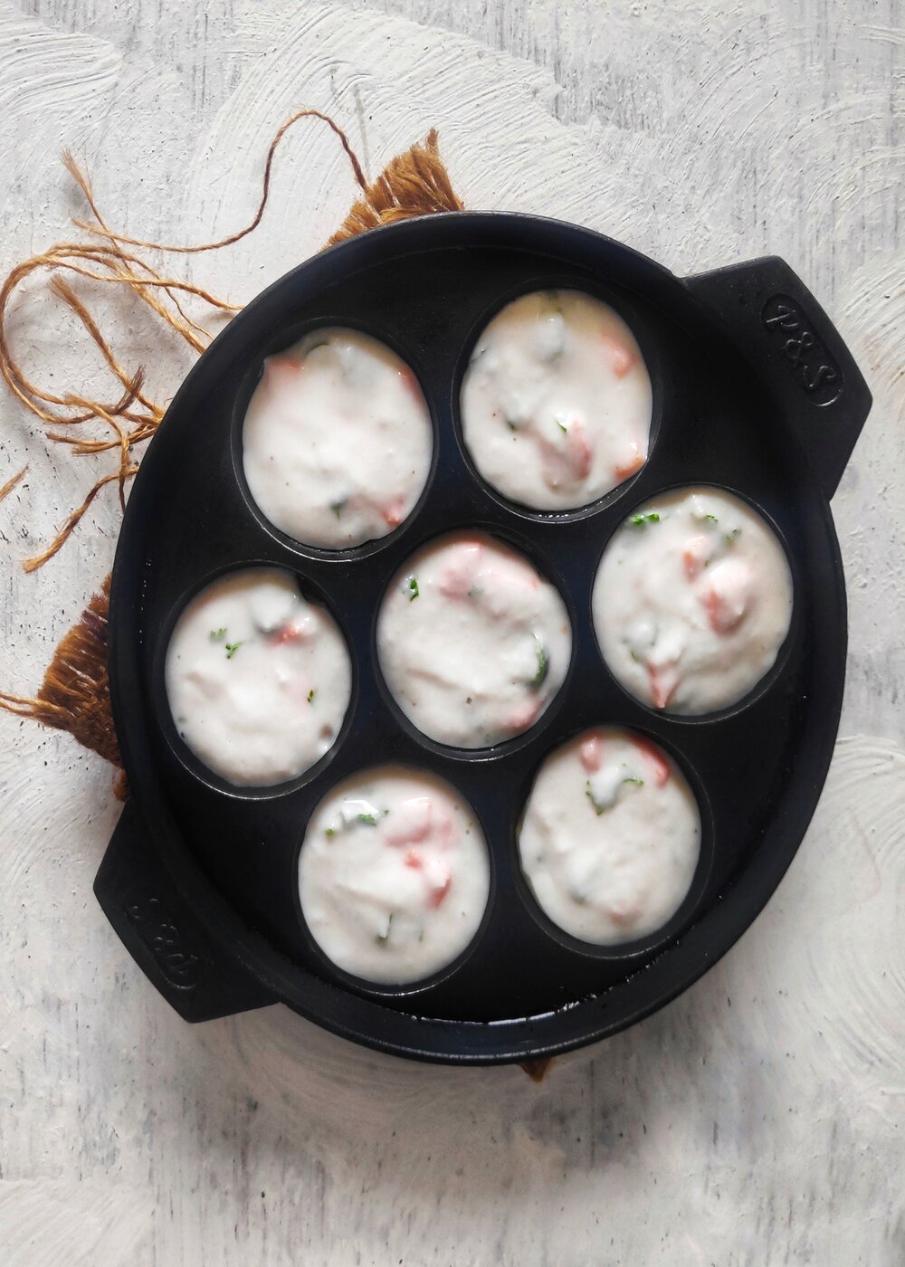 - You can either use a regular idli stand or a paniyaram to make idli masala dumplings. Now, grease the paniyaram with refined oil and put it on medium flame. Once it is hot enough, you can start filling the mould with the batter.