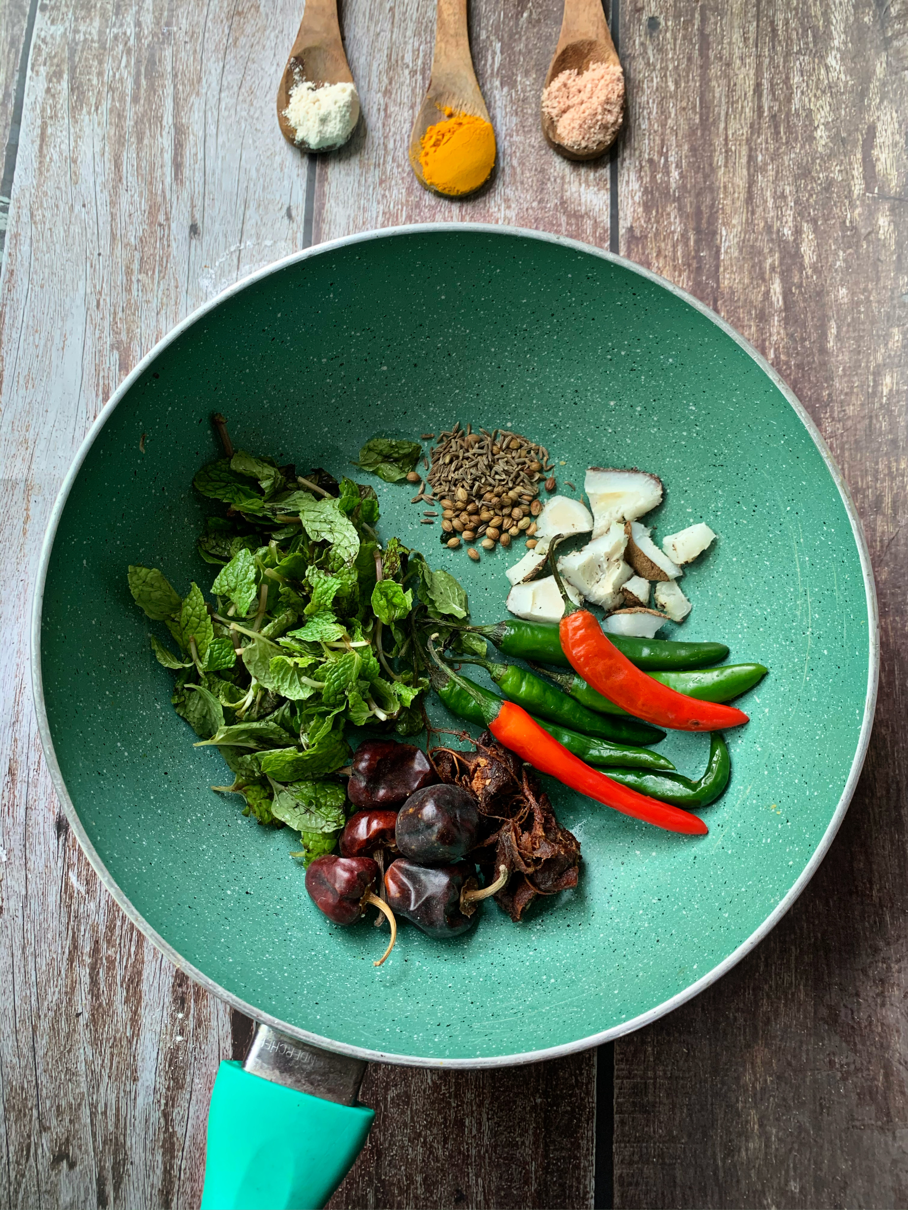 - Now, add mint leaves, coconut pieces & turmeric powder to the same frying pan.