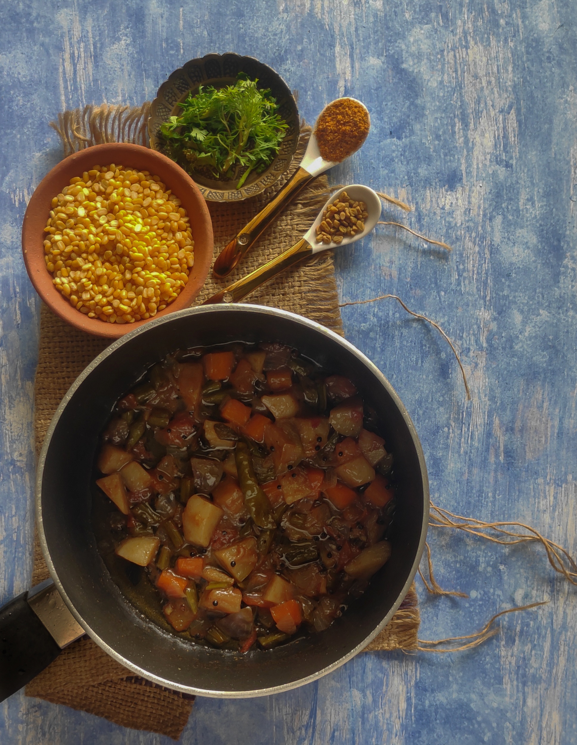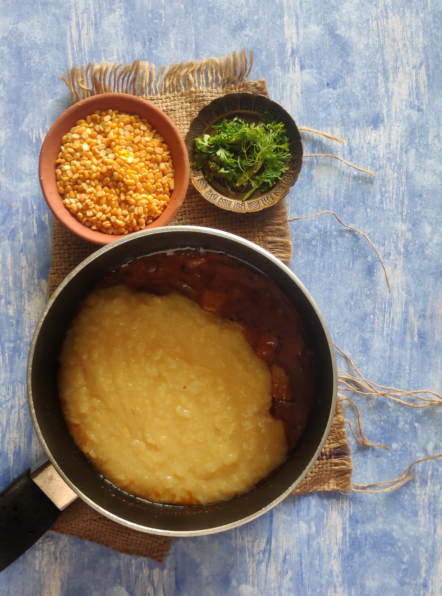 - Prepare a thin consistency of the Moong Dal Sambar by adding about 1/2 cup water.