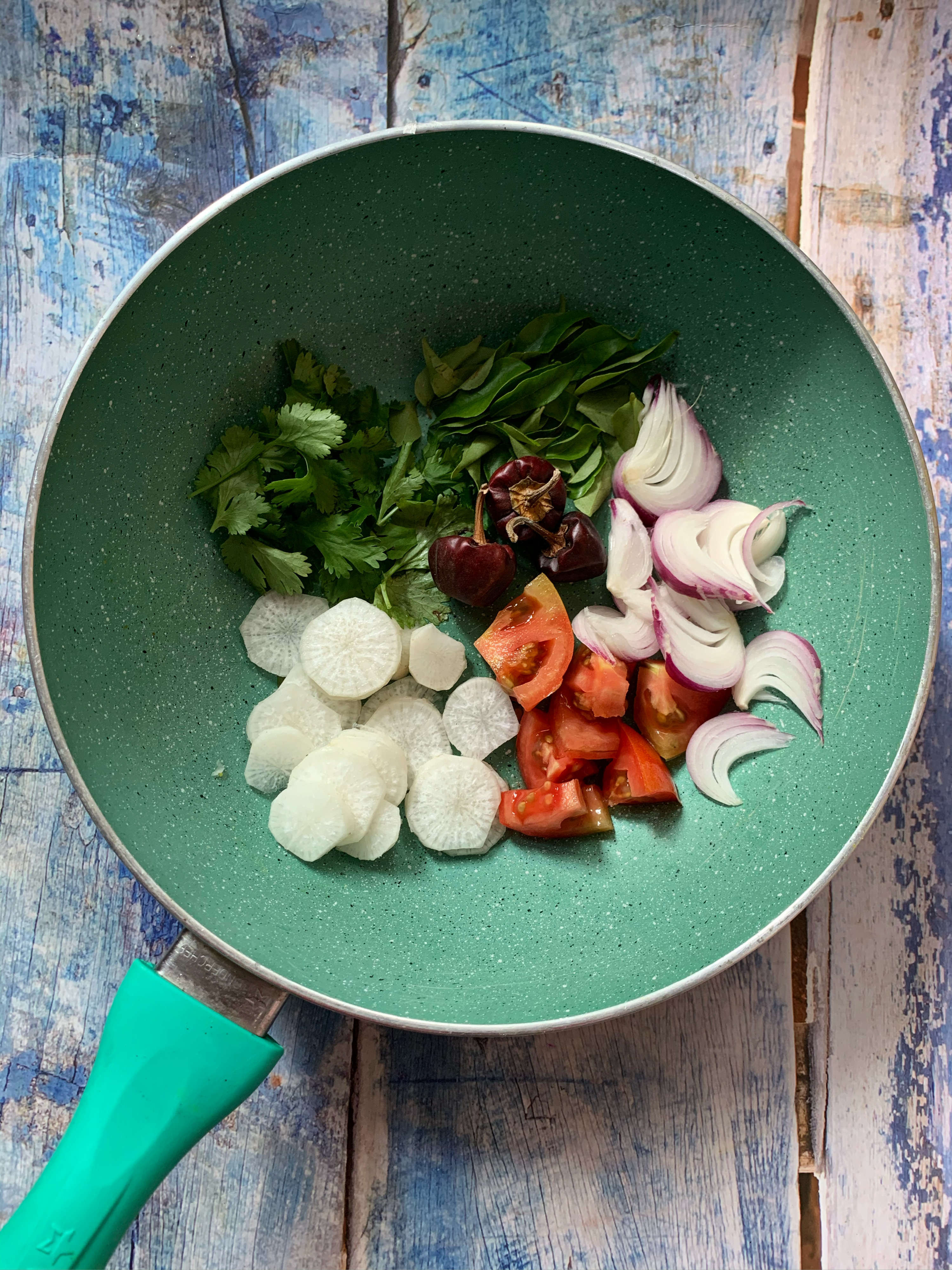 • Take a radish. Wash it and peel it. Slice the clean, peeled radish in round, even slices. Ensure there is about 2 cups of radish. Cut all the other veggies like shallots, tomatoes, etc., and keep them aside.