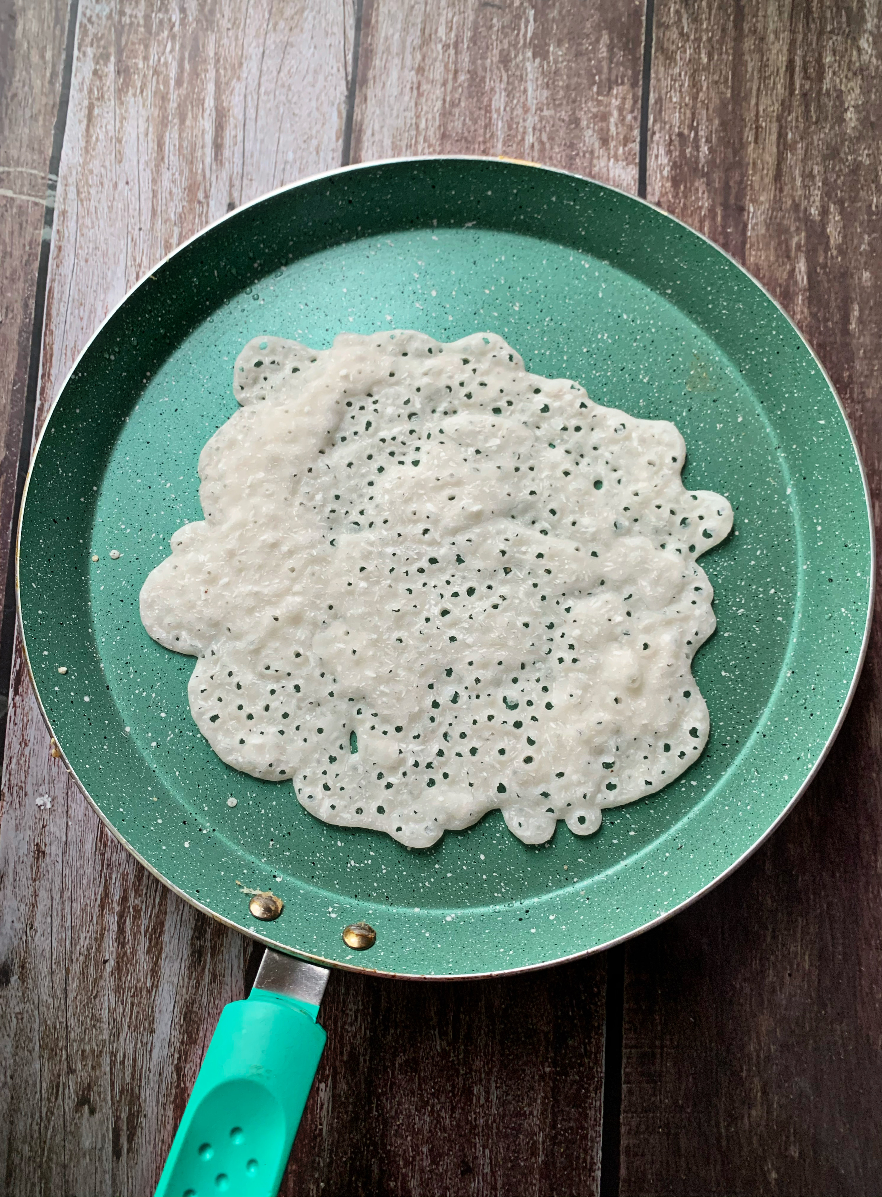 • Heat a pan, sprinkle some water. This prepares the surface of the pan for the batter.