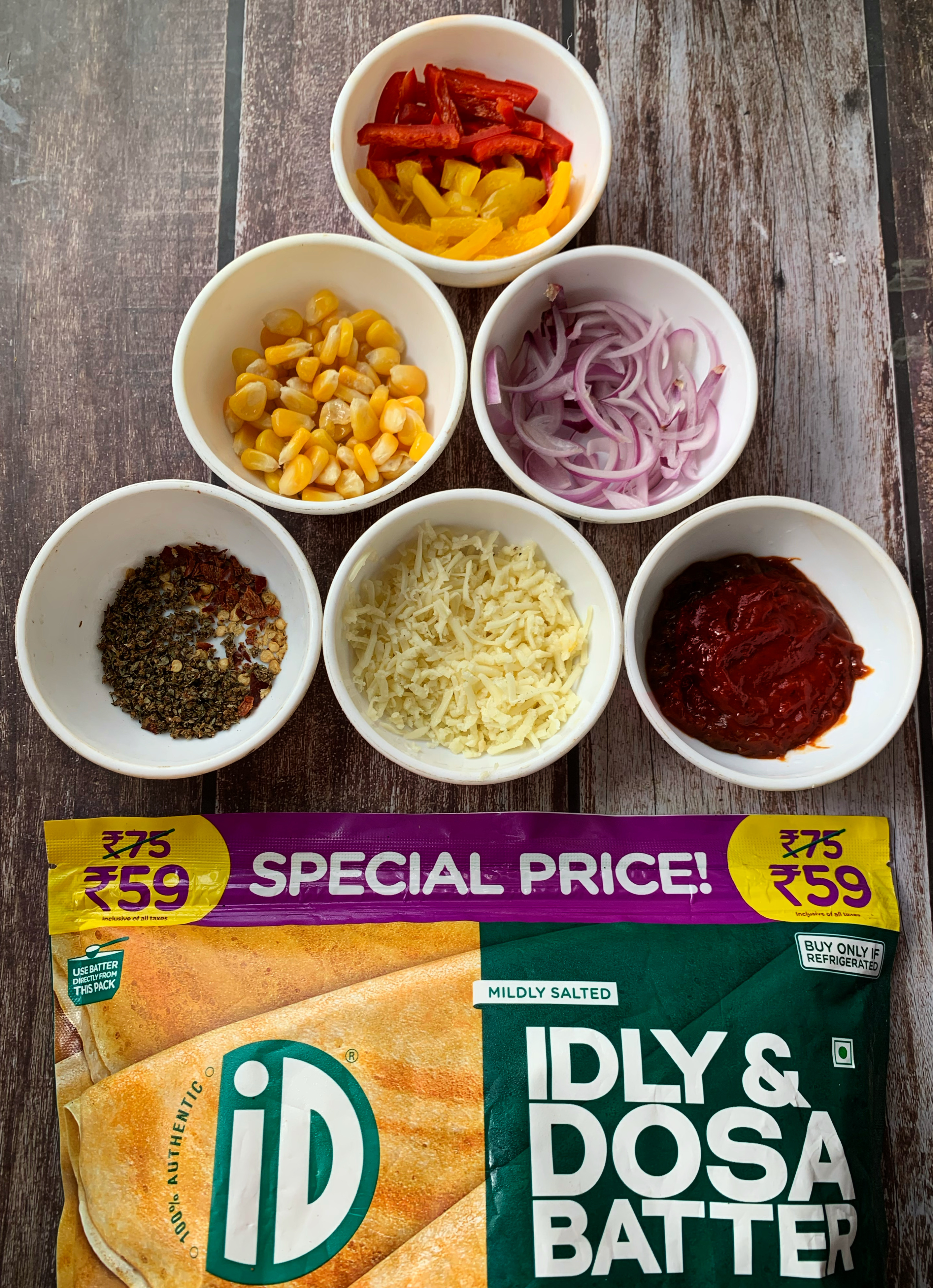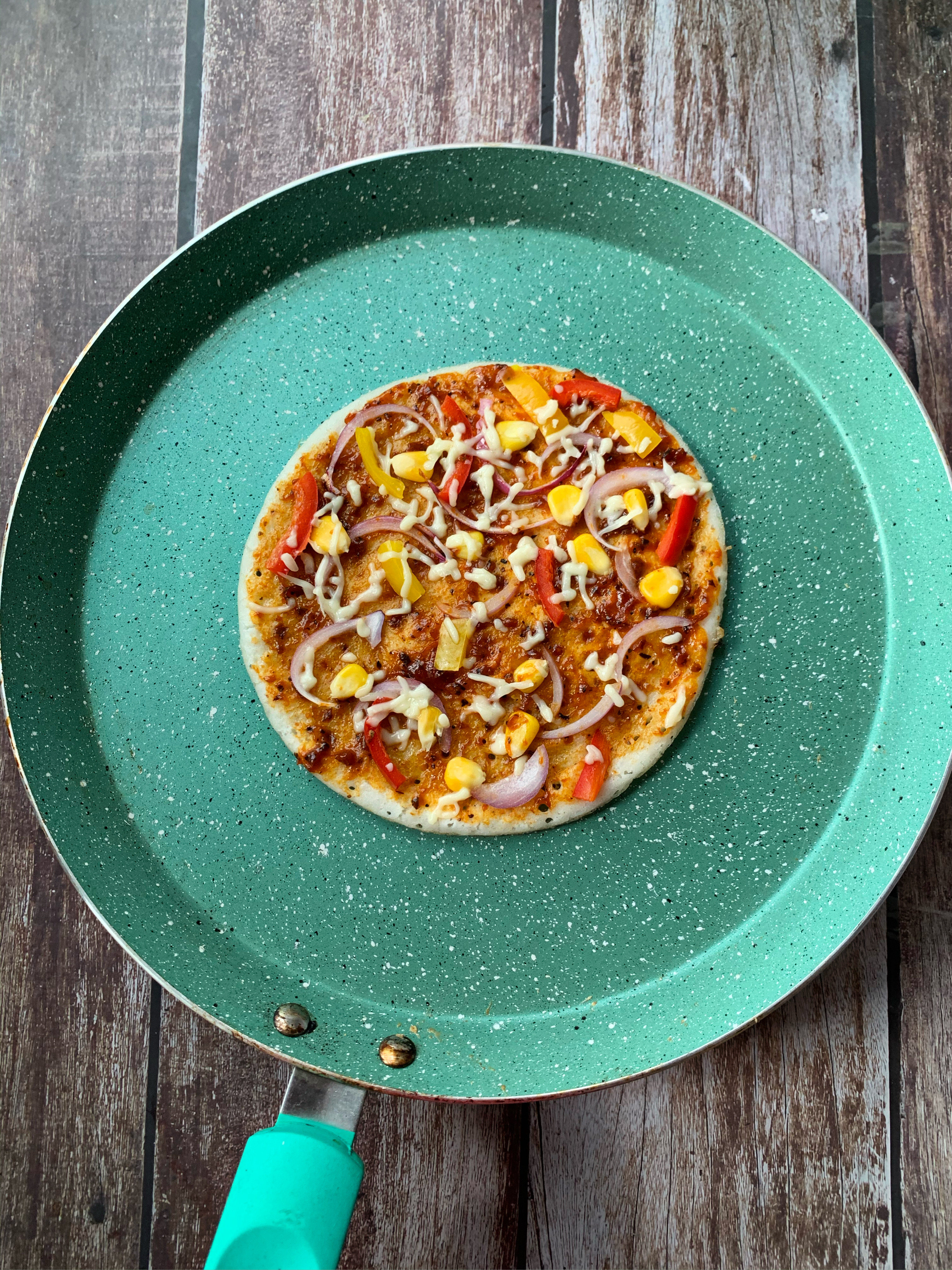 - Once you find the batter cooked from the top, spread the pasta sauce, sprinkle the chopped onions, bell peppers, and sweet corn.