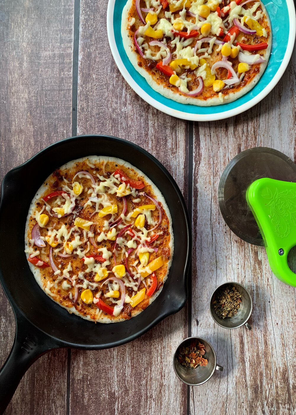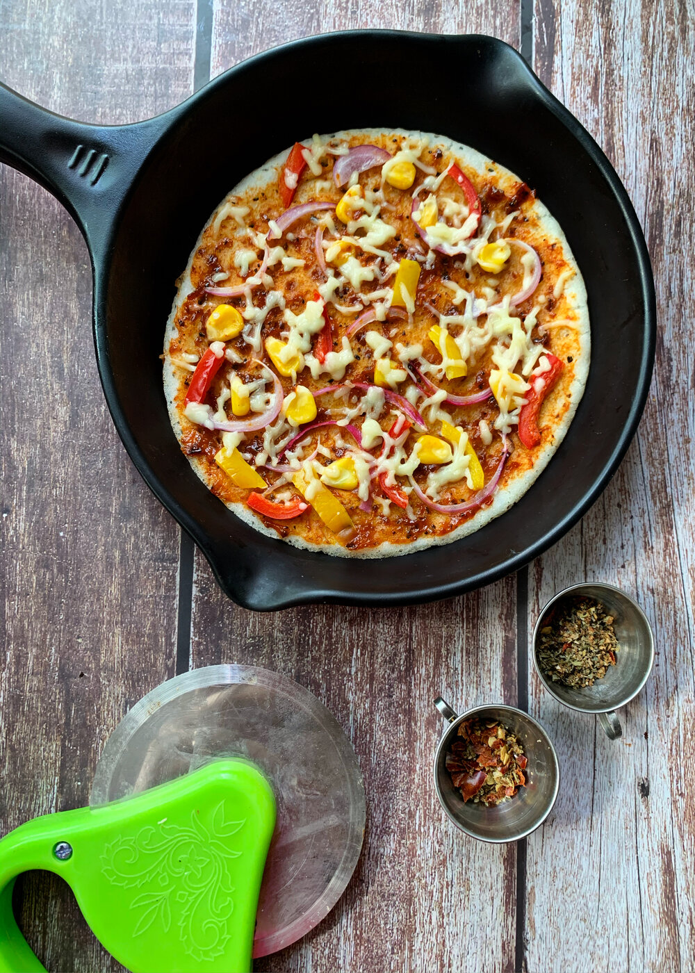 - Lastly, add the red chili flakes and oregano before you cut the dosa pizza into slices.