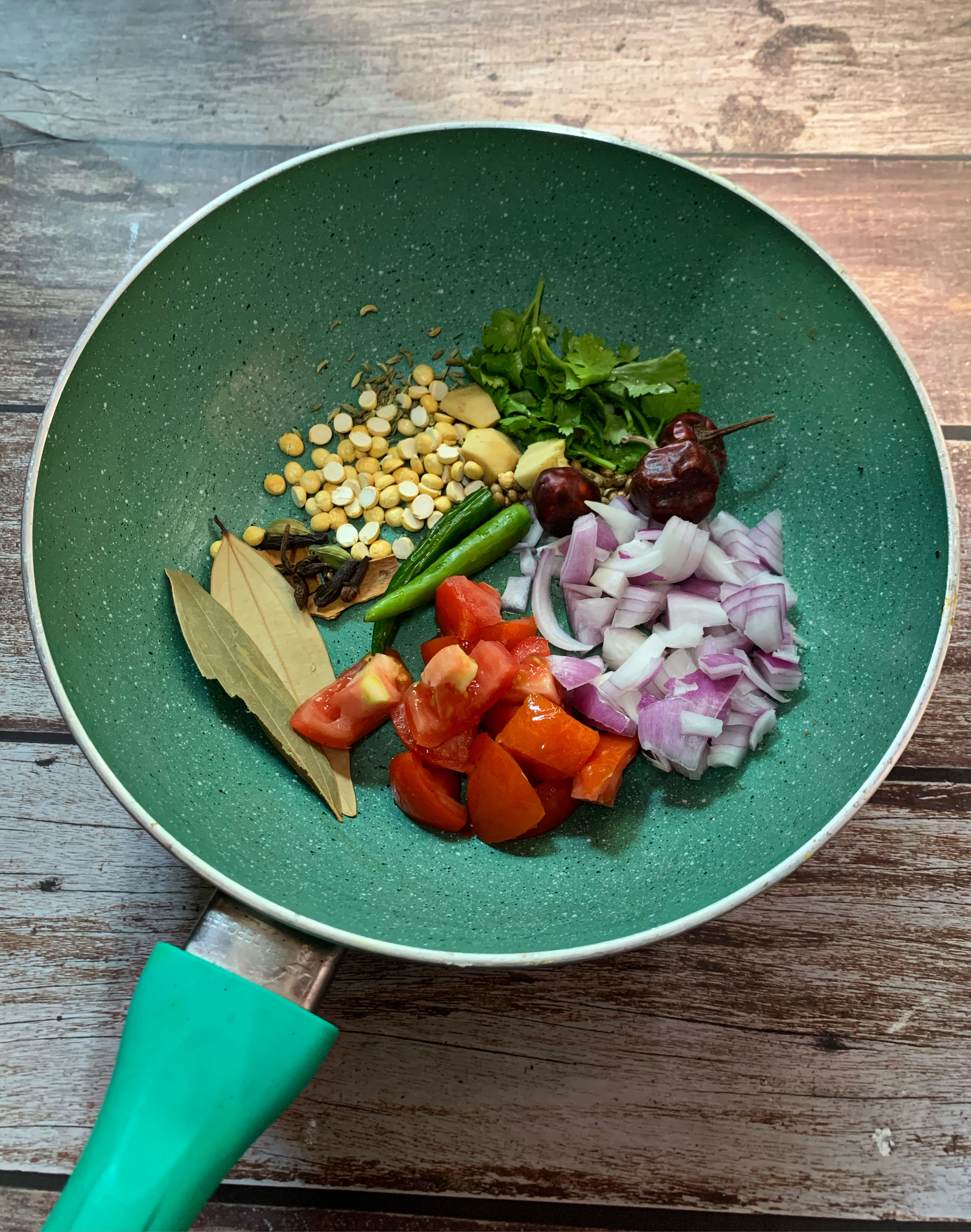 - In a large pan or kadhai, heat 2 tablespoons of oil and sauté the cinnamon, cardamom and curry leaves.