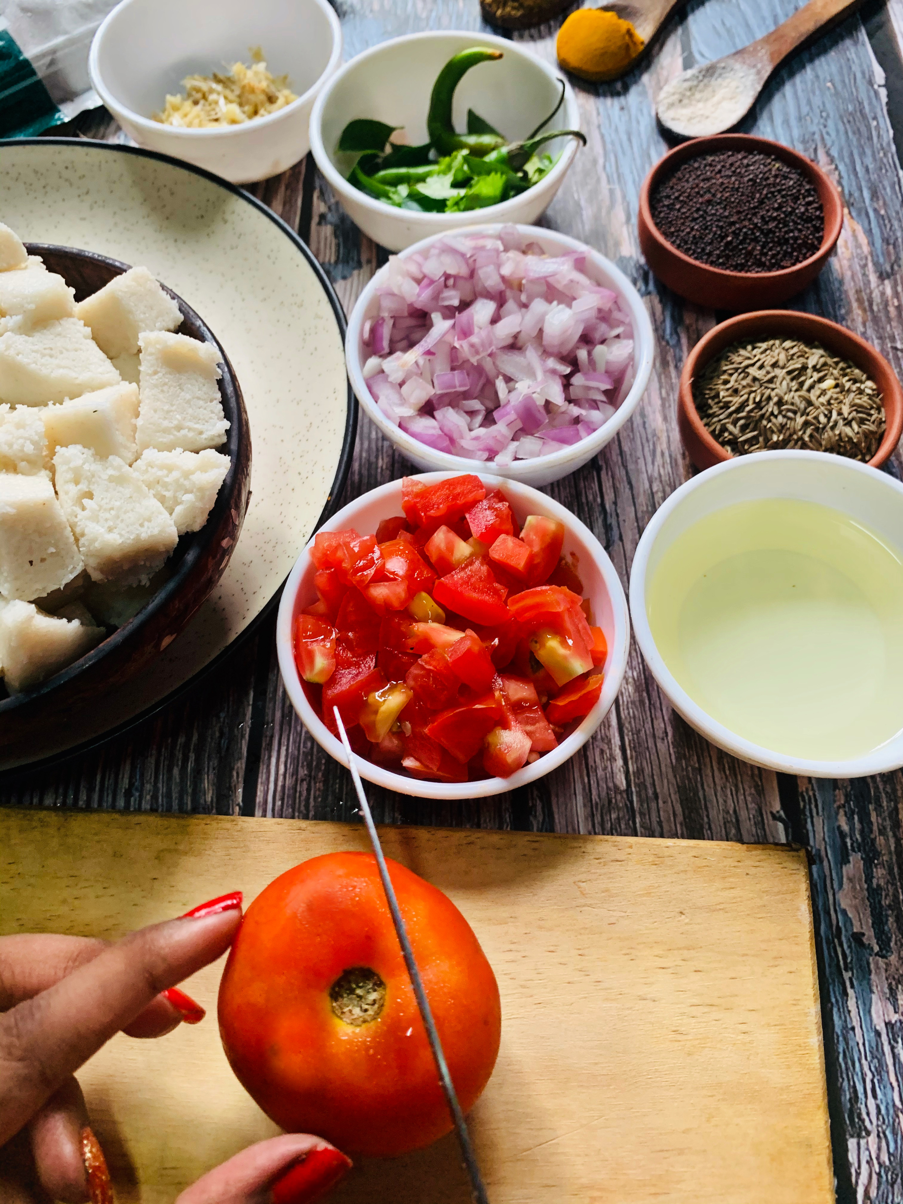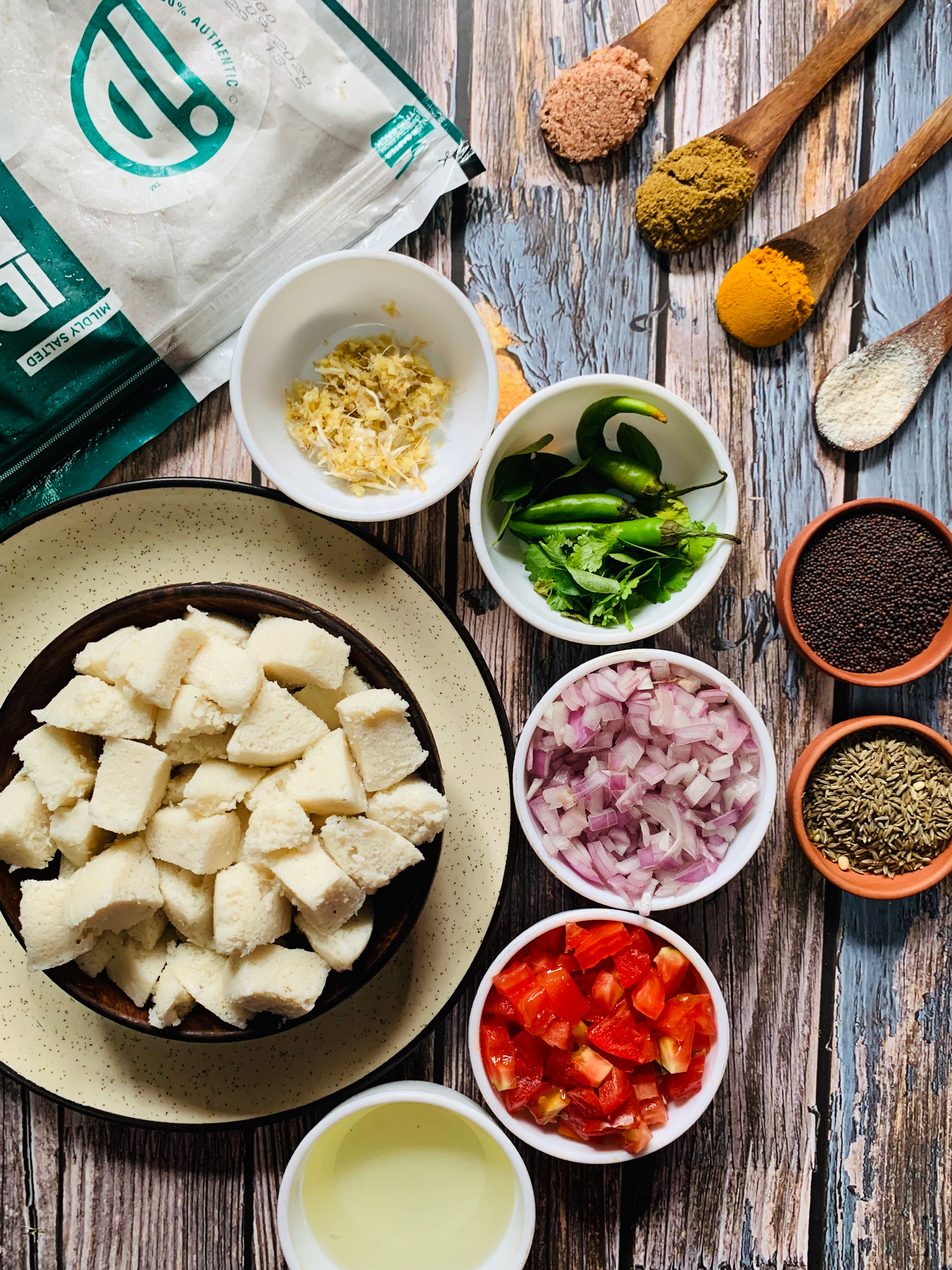 - Cut the idlis into small cubes, try to cut them into smaller cubes because they easily